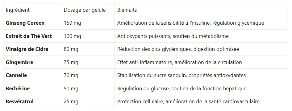 Stabilité de la glycémie : Les ingrédients naturels du produit contribuent à réguler doucement le taux de sucre dans le sang, ce qui peut réduire les fluctuations d’énergie et limiter les envies de grignotage.